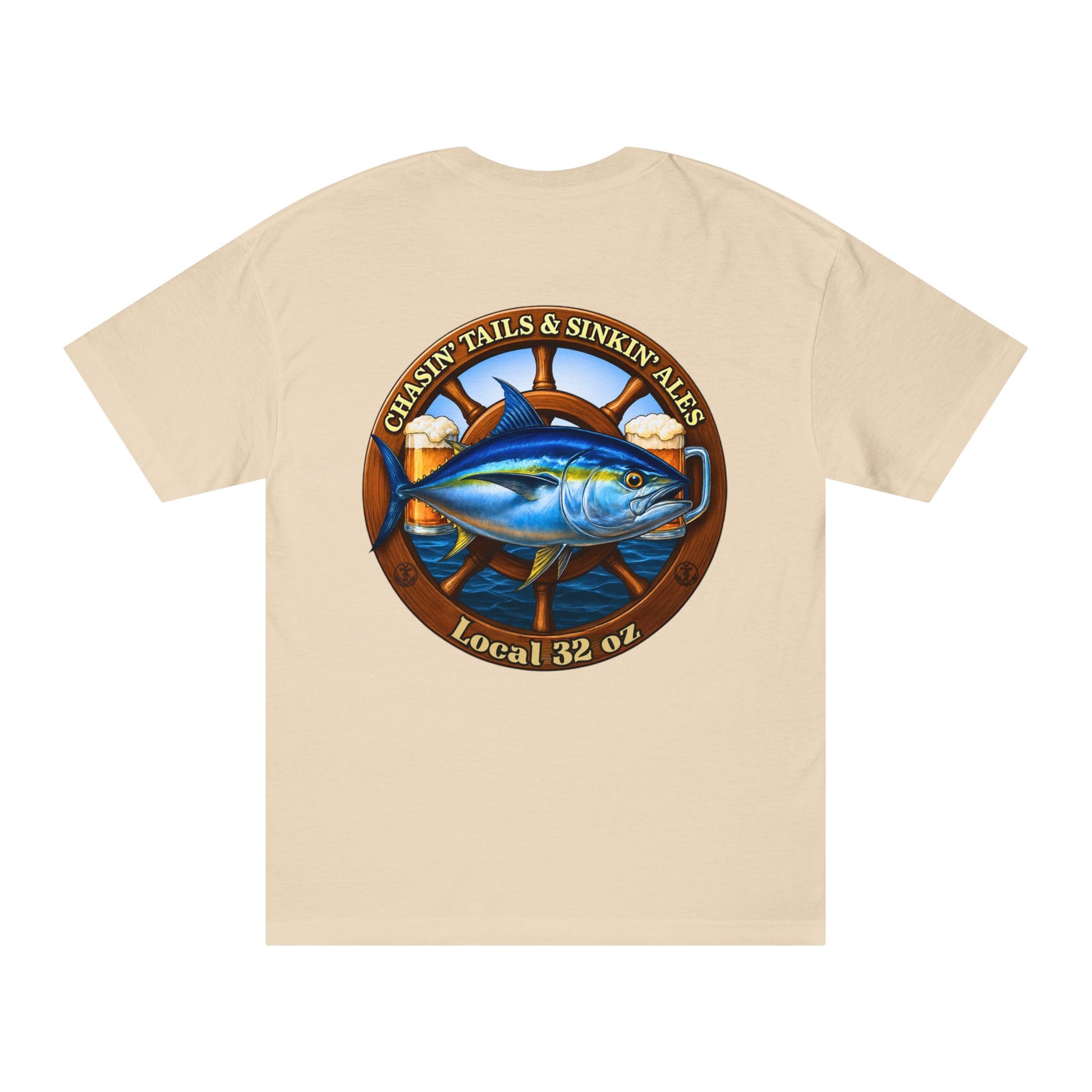 A fishing and beer graphic design tee. Chasin' tails and sinkin' ales are two of your favorite things. Gives off a casual and laid-back vibe, great for weekend outings or fishing trips. Ideal for beer enthusiasts and those who enjoy a relaxed style. Relevant for Father's Day, summer BBQs, and fishing trips.